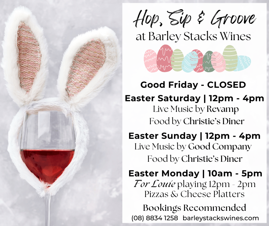 The Barley Stacks Wines Cellar Door and Function Centre is open 10am-5pm 7 days a week. Tasting experiences, electric car charging as well as pizzas and cheese platters are also available 7 days a week.